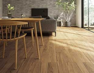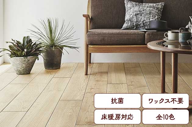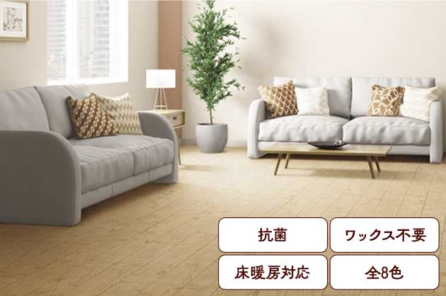 一般フロアーに比較し、床面への水濡れや洗剤による変色、シミ、ひび割れが起こりにく製品です。