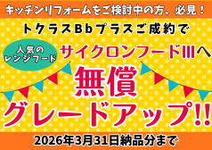 キッチンリフォームをご検討中の方、必見です! トクラスのキッチン「Bbプラス」をご成約いただくと、人気の「サイクロンフードⅢ」へ無償グレードアップできます! トクラス Bbプラス 熱や衝撃、汚れに強く、お手入れ簡単な人造 […]