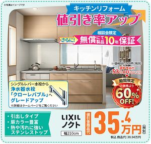 キッチンリフォームで、シングルレバー水栓から浄水器水栓「クローレバブル」へ無償グレードアップ!