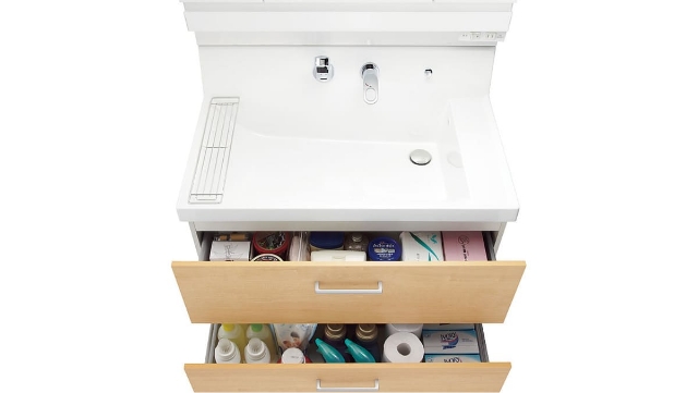 鏡裏の収納スペースには自由に設置できるトレイがあるので、高さが違うものでもピッタリすっきりと収納できます。