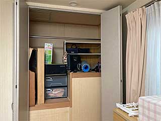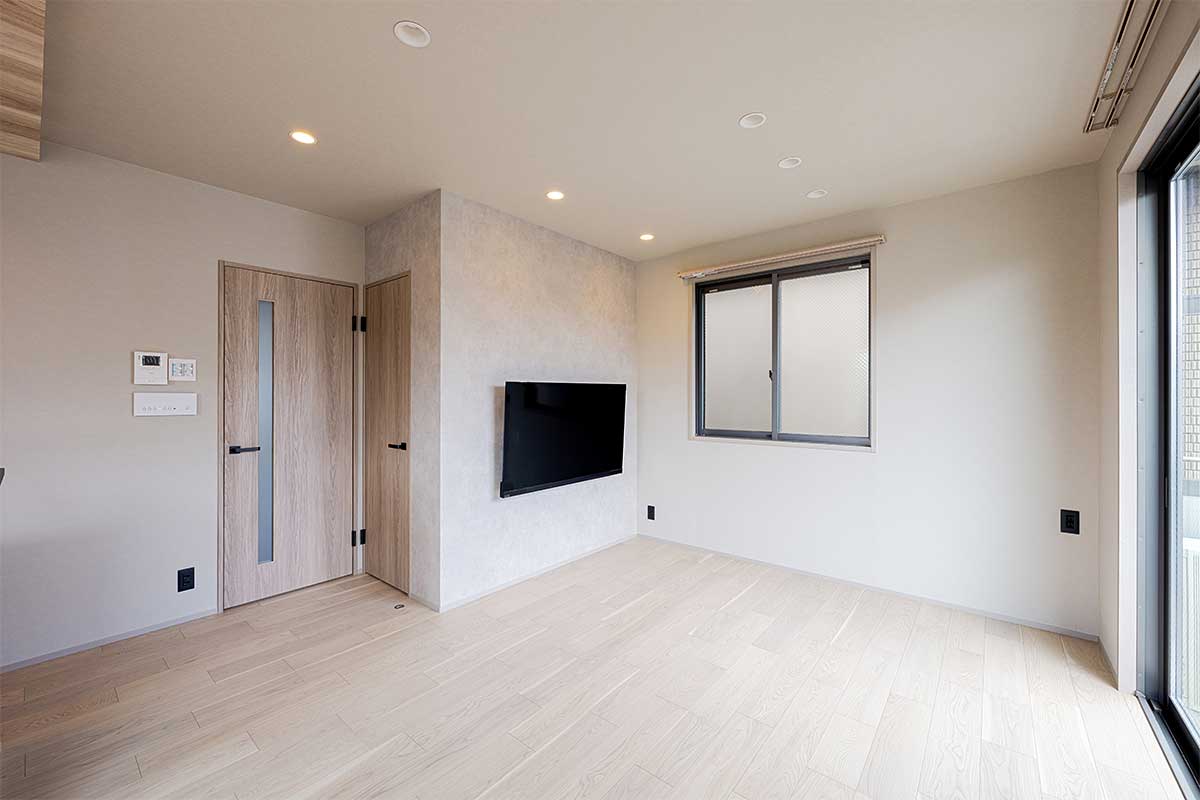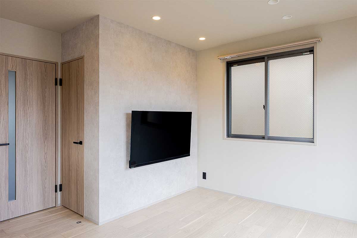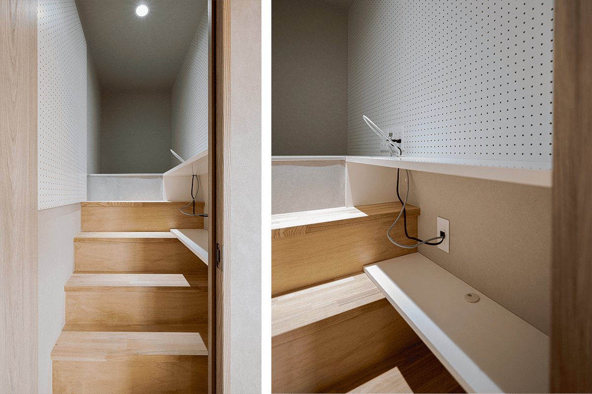 階段上のクローゼットは、扉が付いていた面にテレビを設置し、脇にドアを取り付けました。通常、壁掛けテレビは、電源やアンテナ線等を隠そうとすると壁の中に線を通す必要があり、買い替え時の通し直しに苦労します。S様邸では、壁の裏側にジャックがあるので、見た目も美しい上に、楽に差し替えることができます。