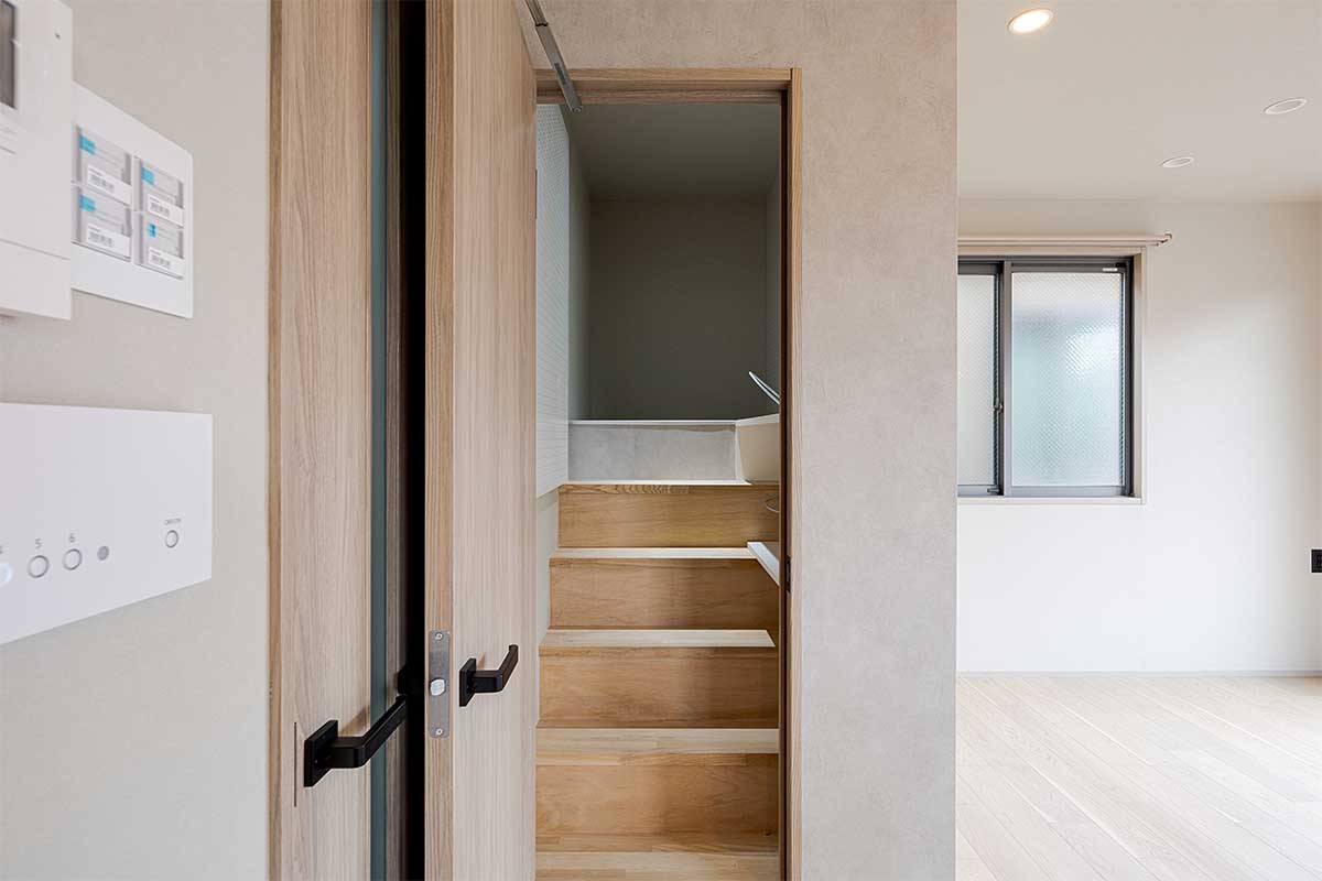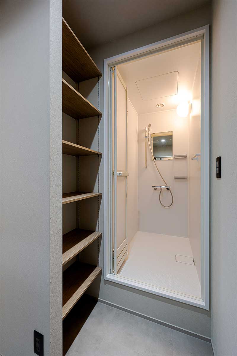 LDKと寝室の間に洗面室とシャワー室を設けたことで、LDK⇔洗面室+シャワー室⇔寝室⇔廊下を一周する回遊動線がうまれ、移動がスムーズにできる間取りになりました。寝室と洗面室+シャワー室の間の扉は、普通のドアより音漏れを軽減する音配慮ドアを採用しています。