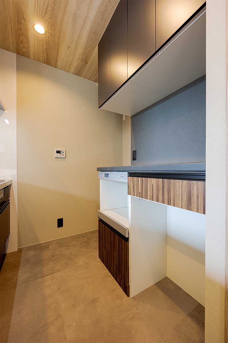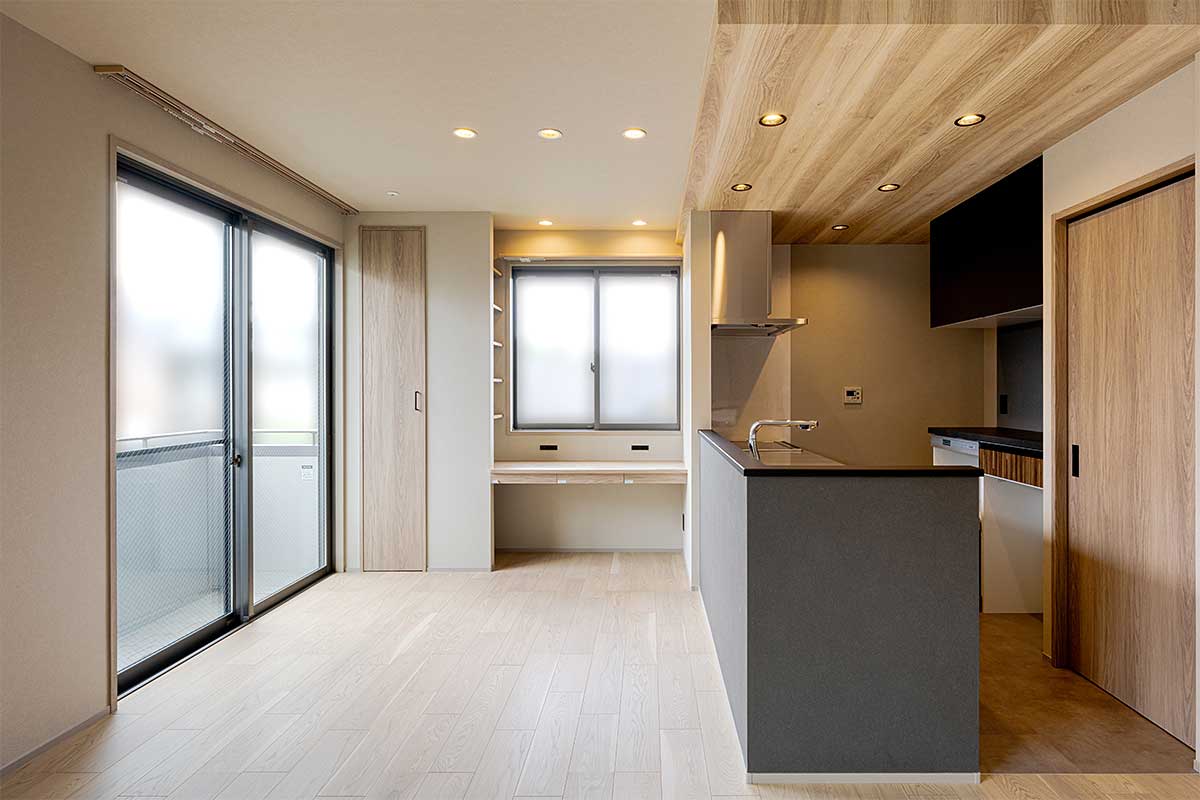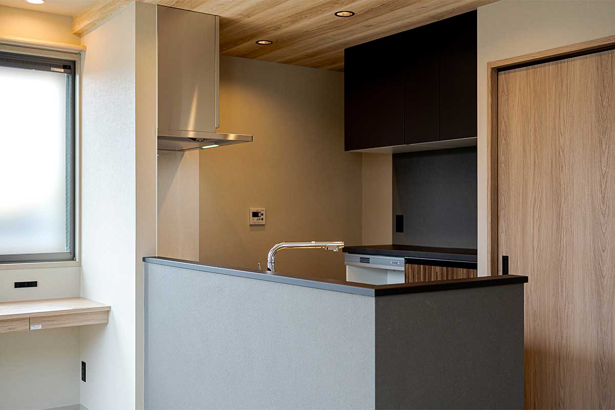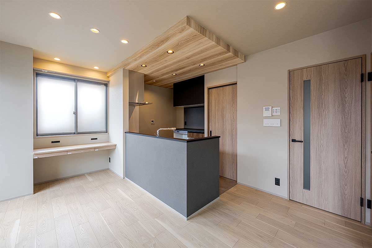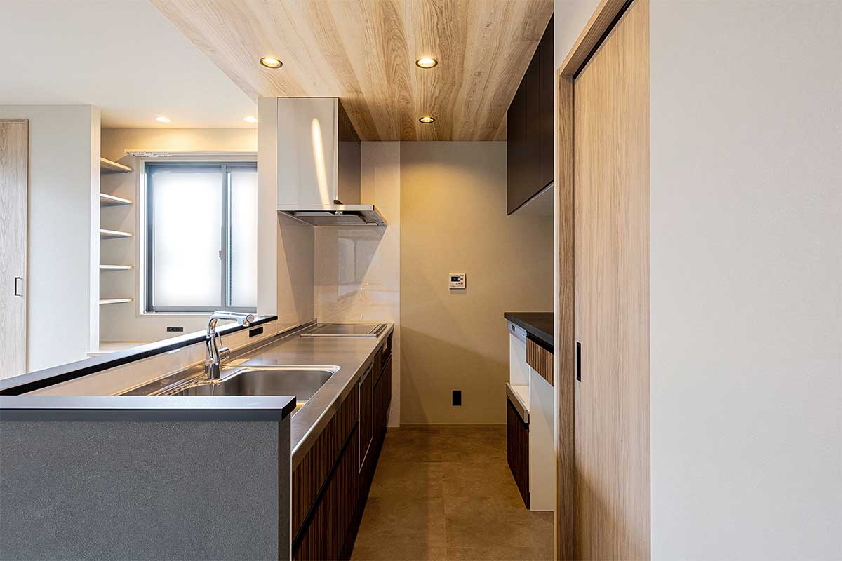木目の下がり天井が印象的なキッチンは、下がり天井、レンジフード裏の袖壁、キッチン前の腰壁の3つの面をズラし、色柄も変えることで、立体感をうみ、空間のアクセントになっています。