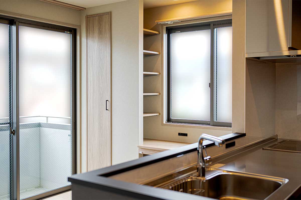 キッチン前のワーキングスペースは、窓際に面した明るい空間です。真上のダウンライトは、カウンター上の調光器で調節もできます。調光器横には、パソコン等の機器も使いやすいようにコンセントもを設けています。LDから見えにくい位置の可動棚は、細々とした文房具や書類を仕舞うのにうってつけです。ワーキングスペース横の収納は、背の高い掃除機が収納しやすいように下段だけL字型の棚にし、扉の内側にコンセントも設けました。
