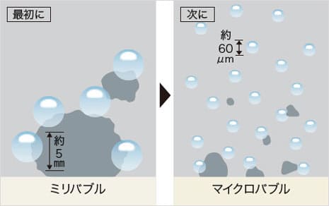 ミリバブル(直径約5mm)で大きな汚れを強力に除去し、次に微細なマイクロバブル(直径約60μm)で残った汚れをしっかり落とします。