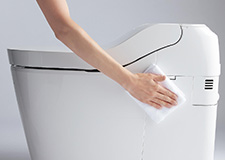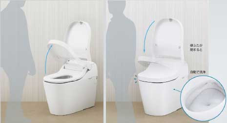 便器に近づくと自動で開き、立ち上がると自動で閉まります。また、便ふたを閉じてから洗浄するので、触らずスムーズにかつ衛生的に使用できます。