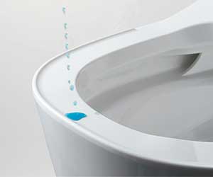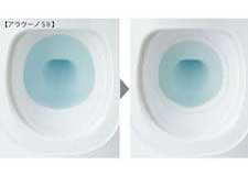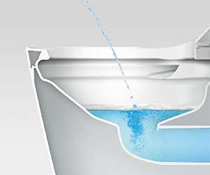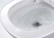 便座を上げる、もしくはボタンを押すと水位が下がり、水面全体に泡が出てきます。トビハネをおさえ、床や壁などへの汚れを抑制します。