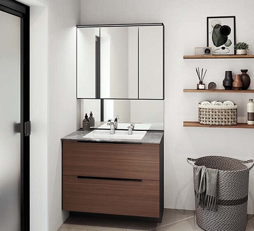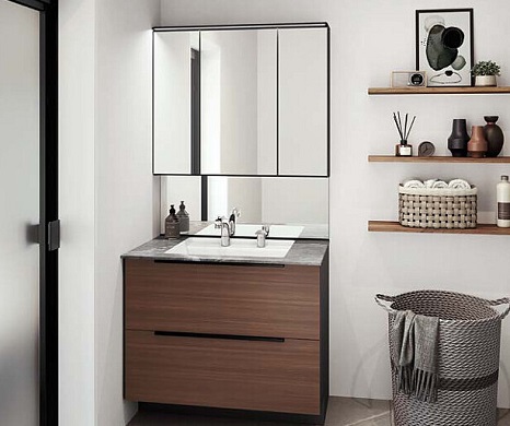 上質を追求したデザイン性の高さと、使う人のことを考えた機能性「すべり台ボウル」は水がコーナーの排水口へまっしぐらに流れる設計で、使うたびにキレイなりお手入れもラクラク。上部の照明に高演色LEDを搭載したミラーキャビネット三面鏡は、シンプルなデザインで自然光に近い光でメイクができます。