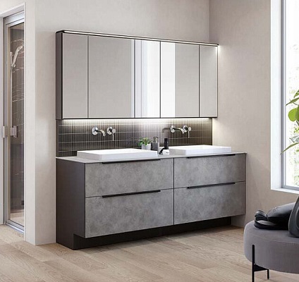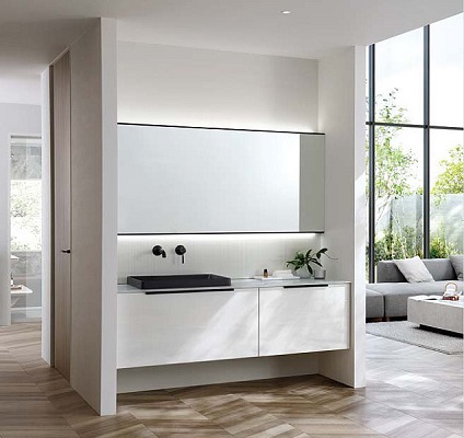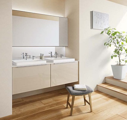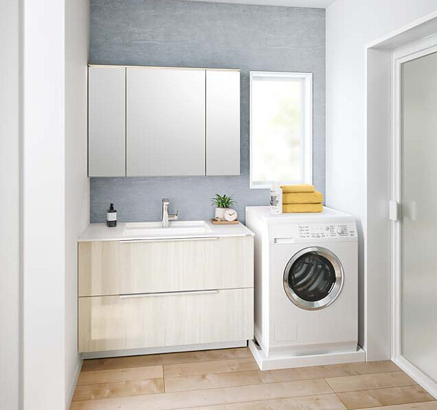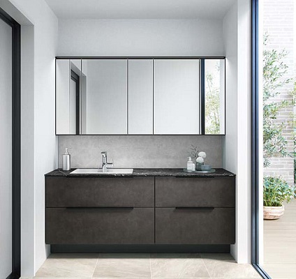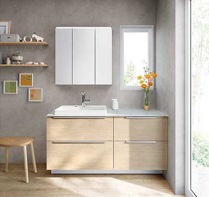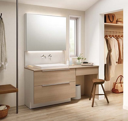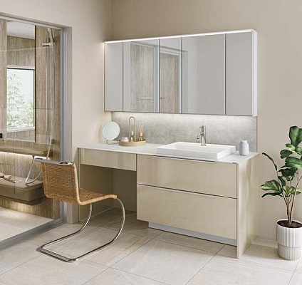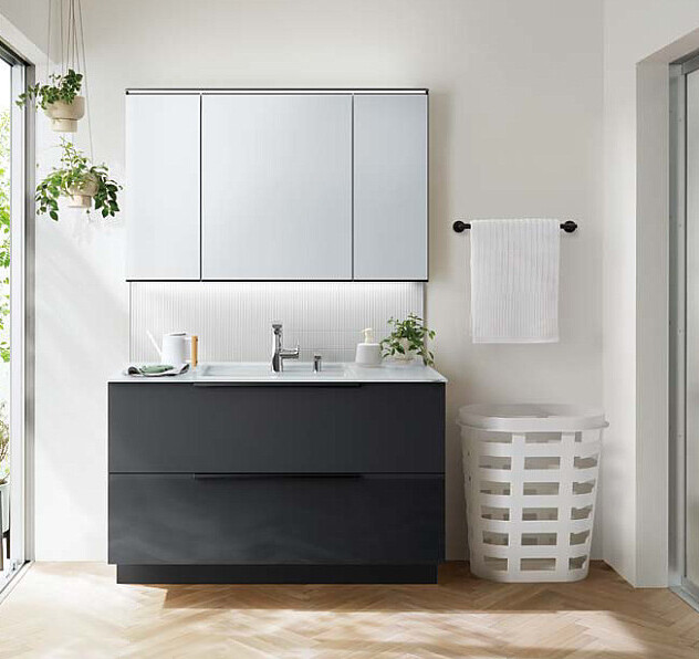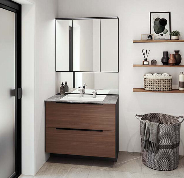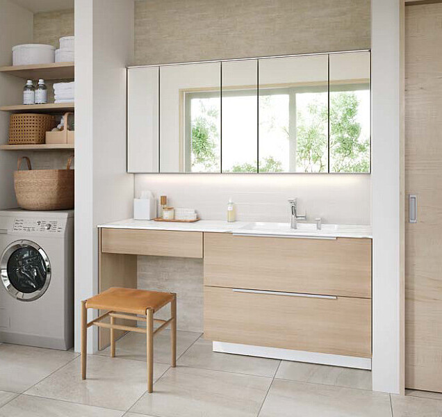 上質を追求したデザイン性の高さと、使う人のことを考えた機能性「すべり台ボウル」は水がコーナーの排水口へまっしぐらに流れる設計で、使うたびにキレイなりお手入れもラクラク。上部の照明に高演色LEDを搭載したミラーキャビネット三面鏡は、シンプルなデザインで自然光に近い光でメイクができます。