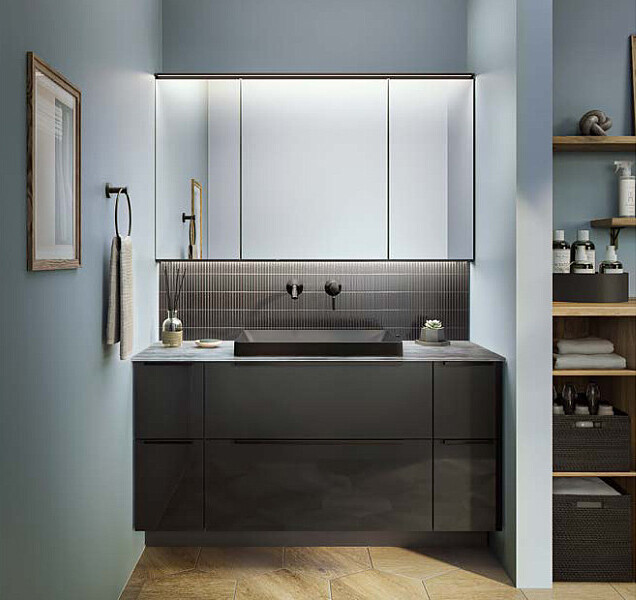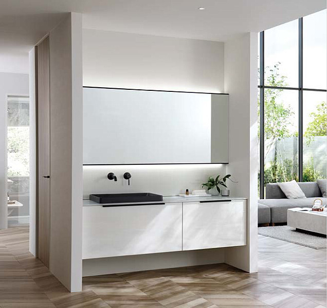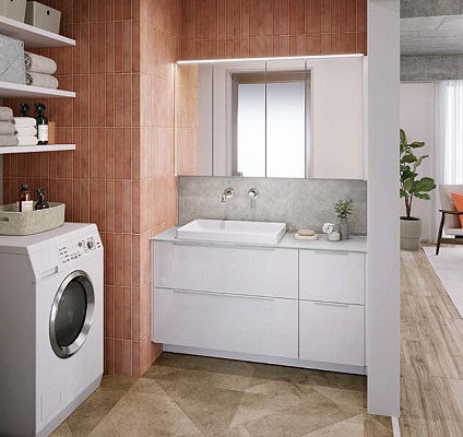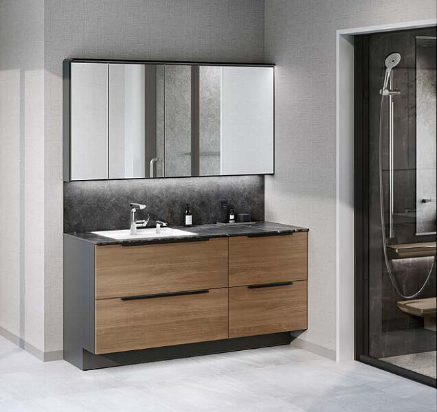 また、キャビネット本体カラーはホワイトとダークグレーの2色。扉カラーがホワイト~ライト系の場合は、キャビネット本体は「ホワイト」、扉カラーがミディアム~ダーク系の場合は「ダークグレー」になります。同系色で統一し、まとまりある空間に仕上がります。