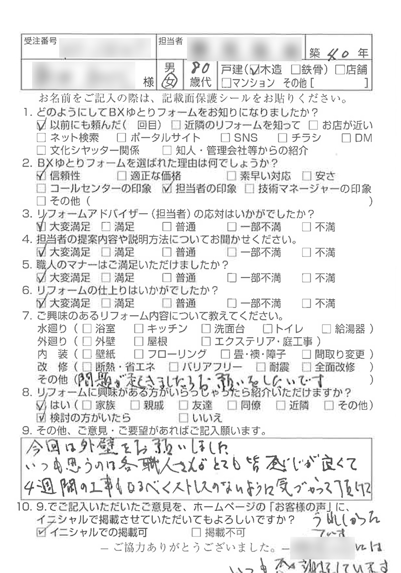BXゆとりフォームではリフォーム工事が終了した際に、施工事例の掲載や、お客様アンケートはがきのご記入・ご投函の協力をお願いしております。