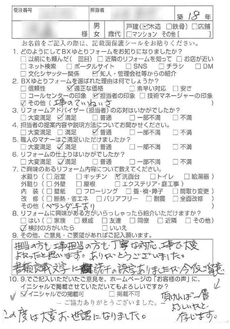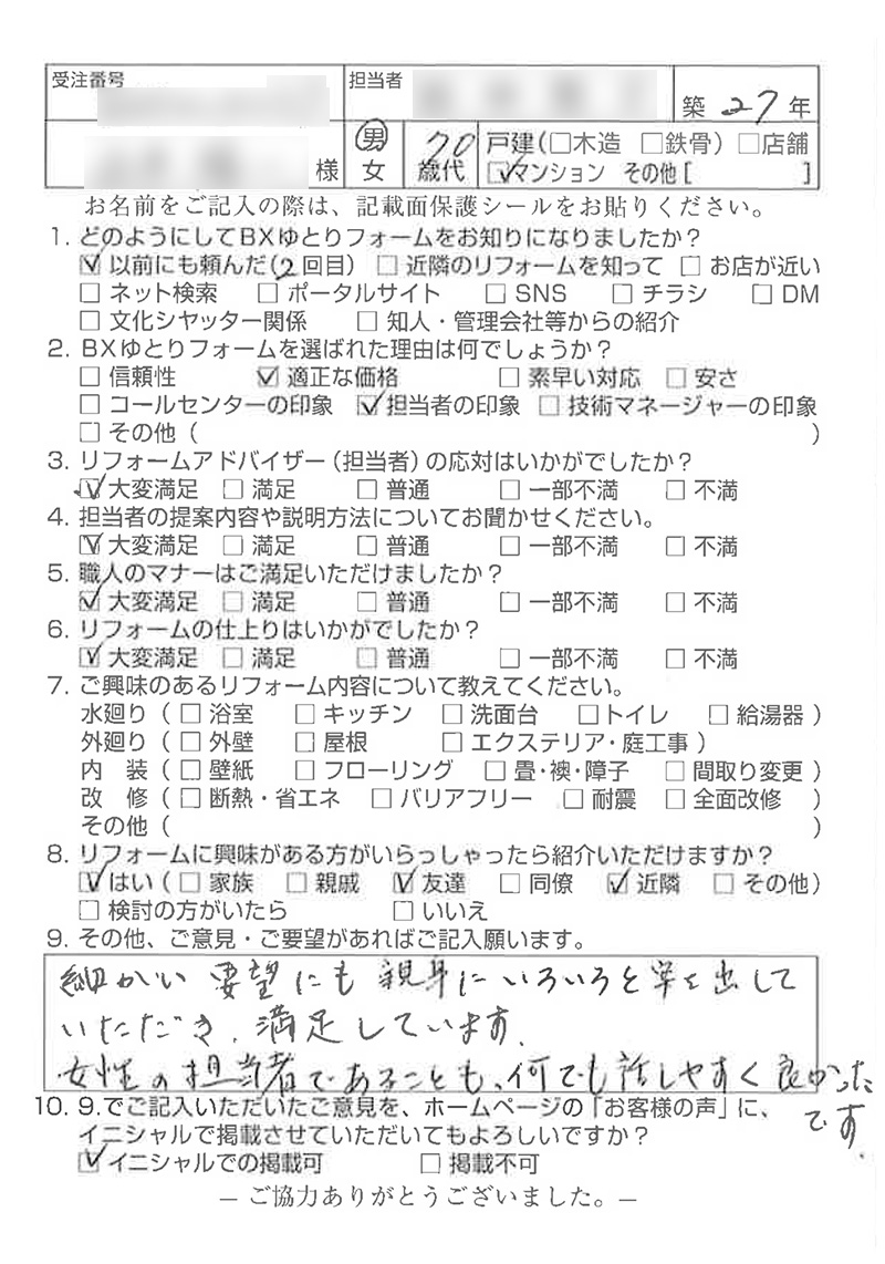 ご担当者様始め、職人の皆様も細やかな気遣いで丁寧にお仕事して下さり、リフォーム後、気持ち良く生活させて頂いております。ありがとうございました。