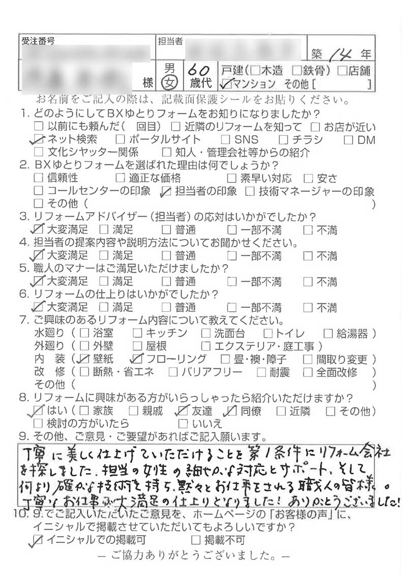 BXゆとりフォームではリフォーム工事が終了した際に、施工事例の掲載や、お客様アンケートはがきのご記入・ご投函の協力をお願いしております。