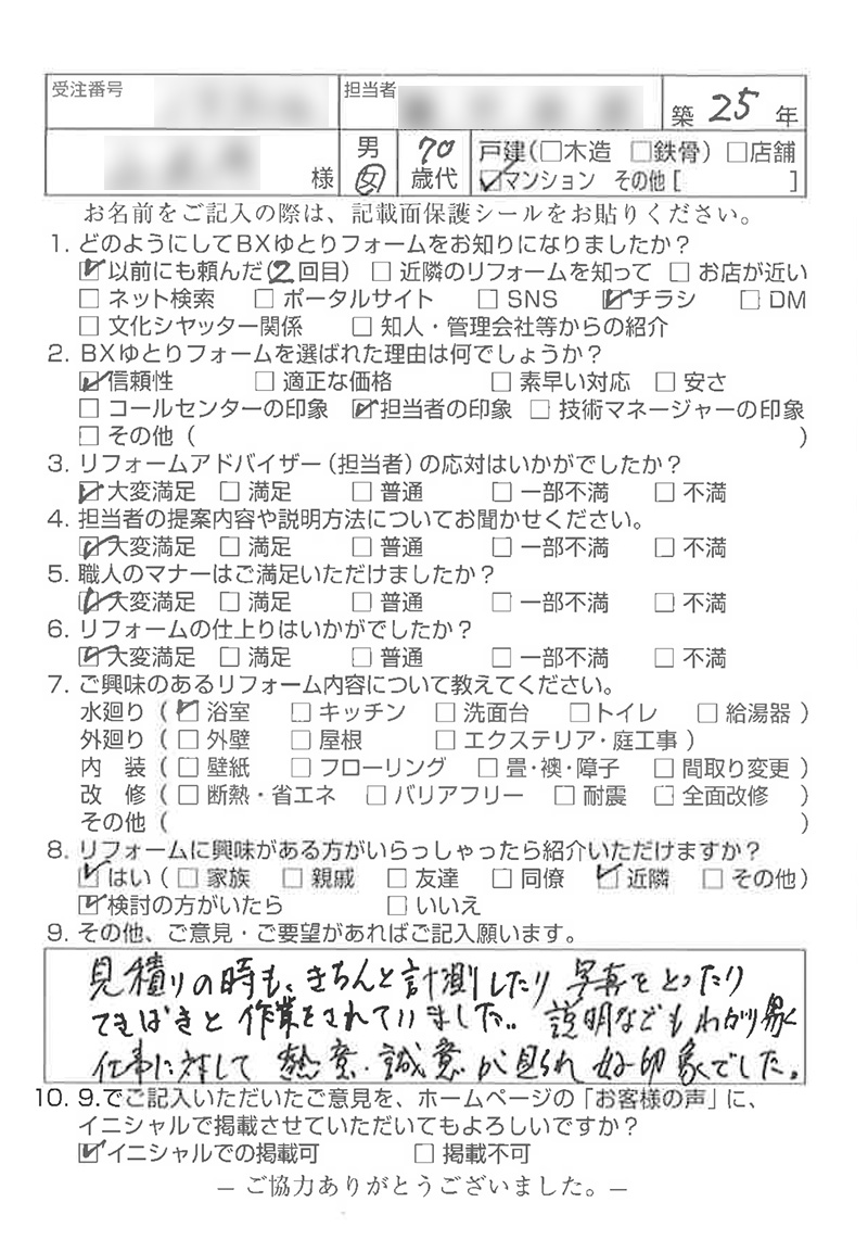 BXゆとりフォームではリフォーム工事が終了した際に、施工事例の掲載や、お客様アンケートはがきのご記入・ご投函の協力をお願いしております。