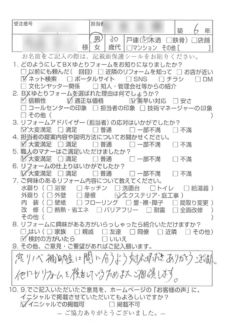 窓リノベ補助金に間に合うよう対応いただきありがとうございました。他にもリフォームを検討しているためまたご相談します。
